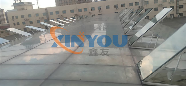 根據(jù)施工圖紙,需先將部分采光玻璃拆除,光滑的玻璃屋面給現(xiàn)場(chǎng)施工增加了難度。現(xiàn)場(chǎng)環(huán)境不允許大型作業(yè)車(chē)入場(chǎng)作業(yè),鑫友售后安裝部員工硬是憑自身力氣將一塊塊玻璃拆除,更換上鑫友電動(dòng)排煙窗。