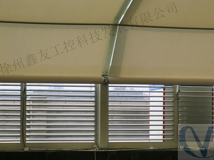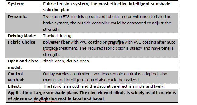FTS天棚簾特別適用于普通電動(dòng)卷簾無法安裝的彎曲、傾斜的場合,整個(gè)系統(tǒng)由驅(qū)動(dòng)系統(tǒng)、面料和控制系統(tǒng)三部分組成,驅(qū)動(dòng)系統(tǒng)采用2個(gè)FTS專用管狀電機(jī),分別安裝在兩條卷管中,面料一端固定在其中一條卷管上,固定面料另一端的鋼絲繩卷曲在另一條卷管的卷繩器上。這兩臺電機(jī)通過一個(gè)專用的控制器協(xié)調(diào)工作,其中一臺電機(jī)提供面料運(yùn)行的動(dòng)力,另一臺電機(jī)的剎車同時(shí)工作,提供一定的阻力拖住面料,避免面料下墜,天棚完全打開后,面料會(huì)卷在其中一條卷管上,運(yùn)行中或停止時(shí)面料均有張力,可制作大面積的平面或弧形面的天棚簾系統(tǒng)。